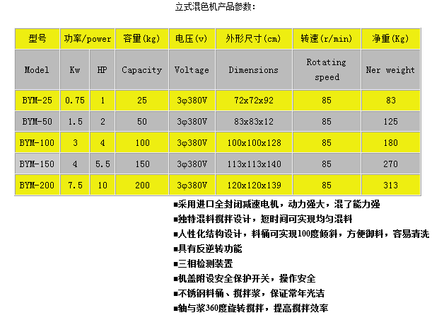 立式混色機特點: 1 、四輪直立式設計,體積小,移動方便; 2、配用擺線針輪減速電機,噪音低、持久耐用; 3、短時間內完成均勻混料,低耗能; 4、桶蓋、桶底沖壓成型,配合精確,更耐用; 5、計時器可在0-30分鐘之間選擇混料時間; 6、全不銹鋼槳葉,結構科學、合理,在工作中可充分攪拌原料,且將負載減小,省時、省電; 7、采用優質不銹鋼材料,高強度,清洗方便。